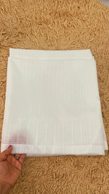 یک پنل پرده آماده دوخته شده پانچ شده با نوار و حلقه اعلا،عرض هر پنل۱.۴۰در قد۲.۸۰ که ۵۰سانت از فضای پنجره را پوشش میدهد.این جنس از حریر به علت بافتی که دارد در حالت چین دار۸۰درصد پوشش دید دارد و نیازی به آستر ندارد.